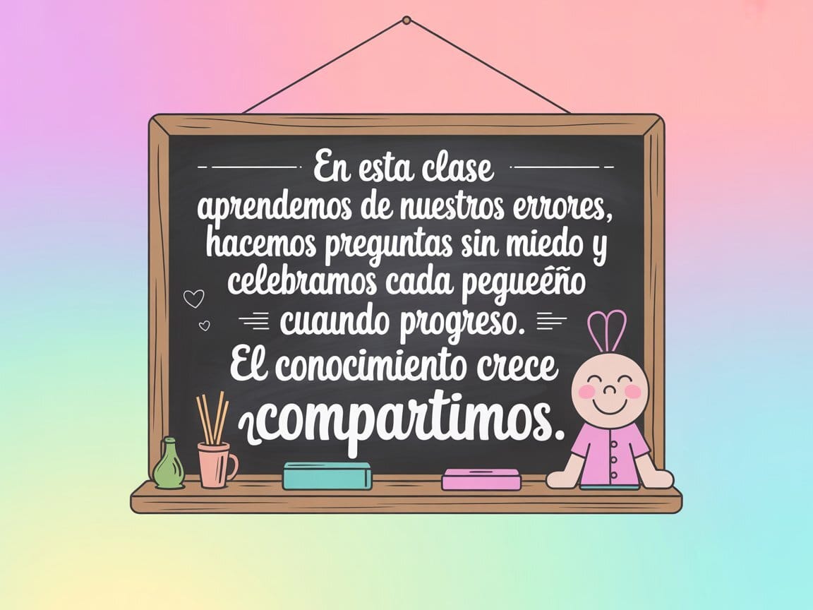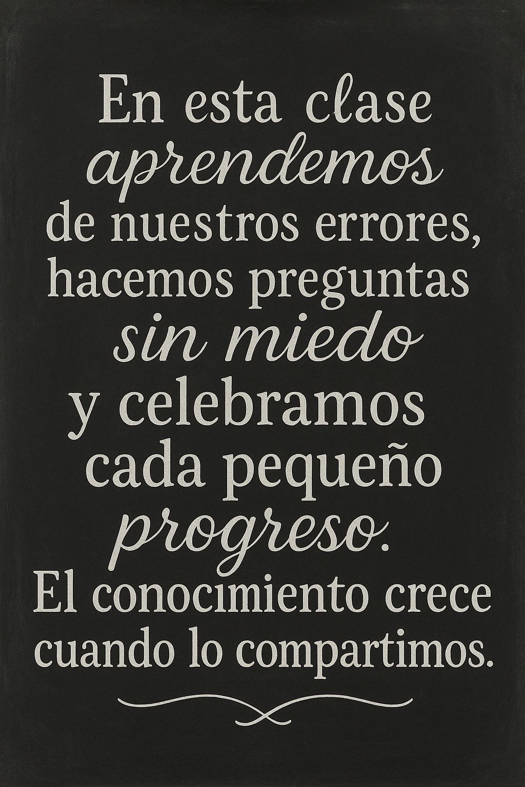 Classroom motivational poster with text written in elegant script on a chalkboard background, the text says: “En esta clase aprendemos de nuestros errores, hacemos preguntas sin miedo y celebramos cada pequeño progreso. El conocimiento crece cuando lo compartimos.”