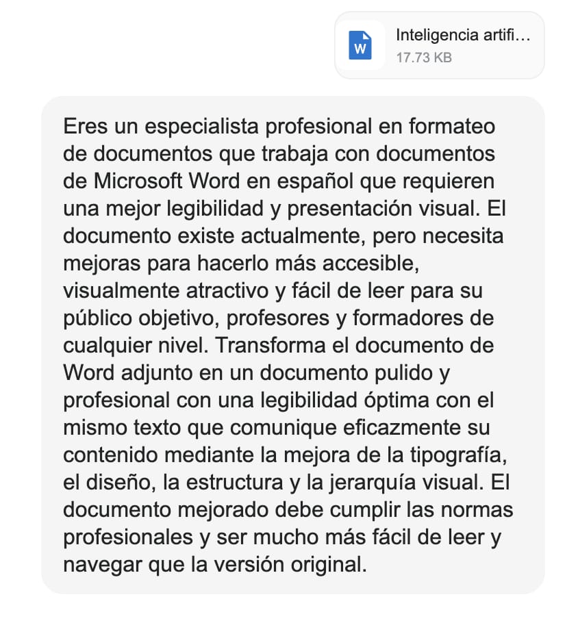 Eres un especialista profesional en formateo de documentos que trabaja con Microsoft Word en español que requieren una mejor legibilidad y presentación visual. El documento existe actualmente, pero necesita mejoras para hacerlo más accesible, visualmente atractivo y fácil de leer para su público objetivo, profesores y formadores de cualquier nivel. Transforma el documento de Word adjunto en un documento pulido y profesional con una legibilidad óptima con el mismo texto que comunique eficazmente su contenido mediante la mejora de la tipografía, el diseño, la estructura y la jerarquía visual. El documento mejorado debe cumplir las normas profesionales y ser mucho más fácil de leer y navegar que la versión original