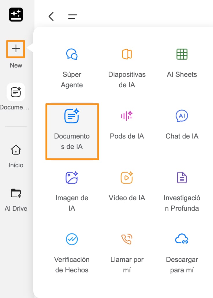 Paso 1 - Accede y selecciona: Entra en genspark.ai, pulsa en + y escoge “Documentos de IA". Ofrece 200 créditos diarios gratuitos pero pueden agotarse rápidamente con transformaciones complejas, pero te sirven para probar la herramienta.