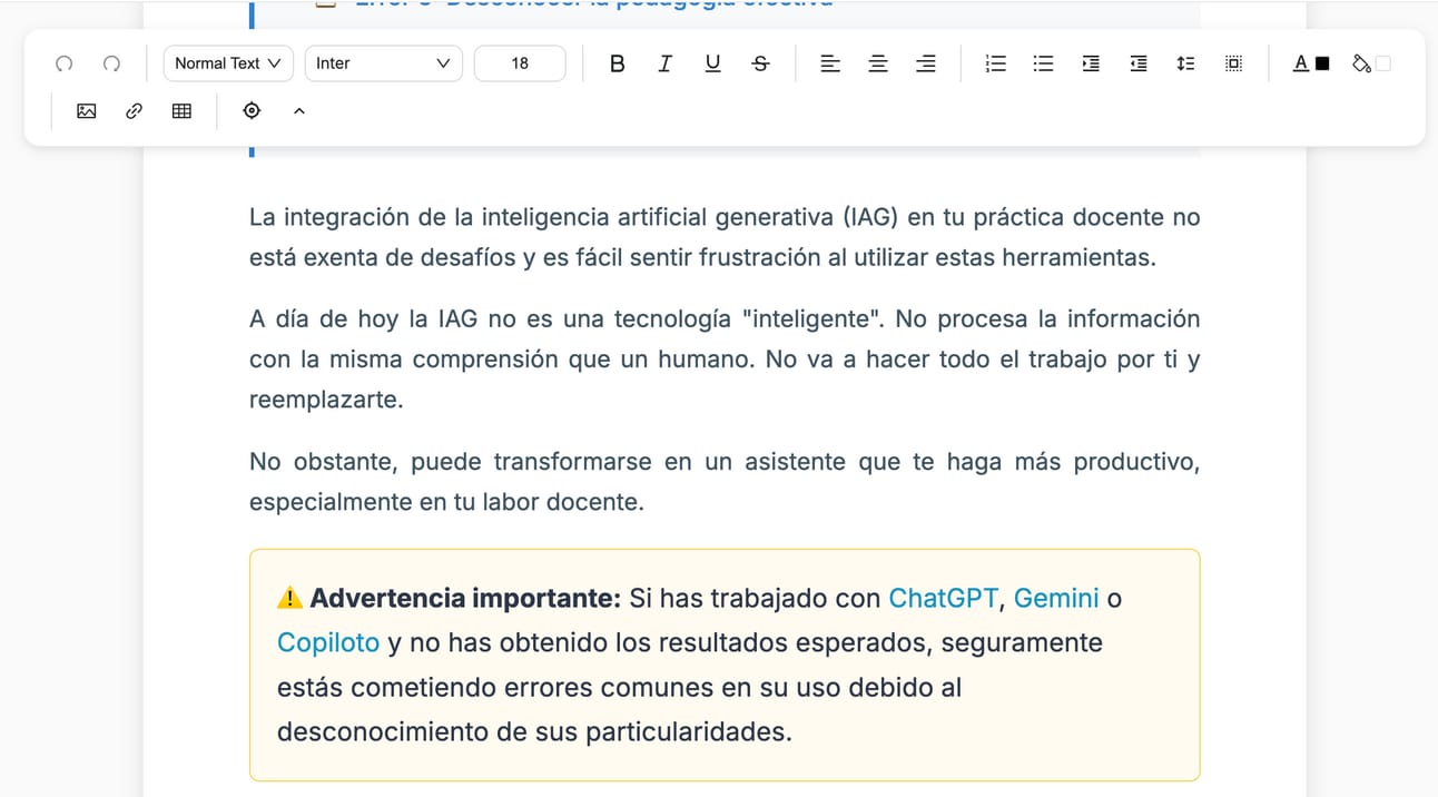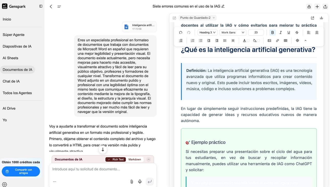 Como formadora creo materiales didácticos con frecuencia en documentos y su edición manual de colores, tipografía, cajas y listas para obtener un impacto visual, consume mucho tiempo. He estado experimentando con Gamma App para la creación de diapositivas, pero a la hora de rediseñar documentos, me ha dado mejores resultados Genspark AI Docs.